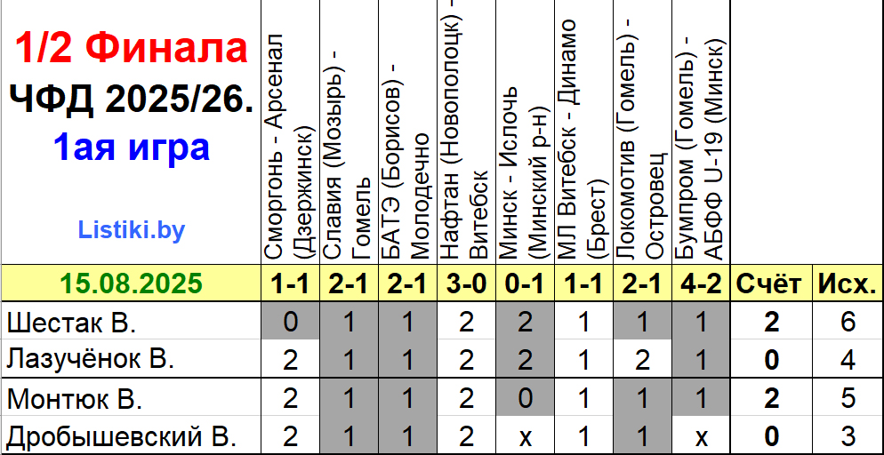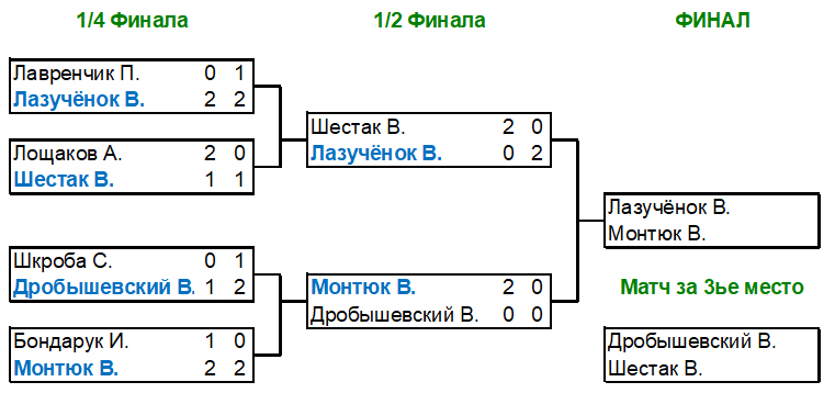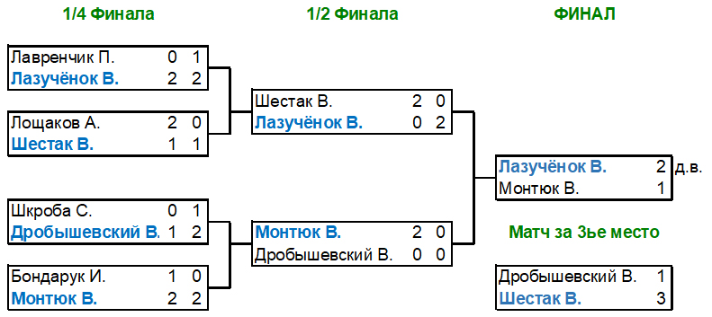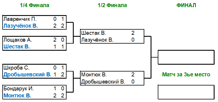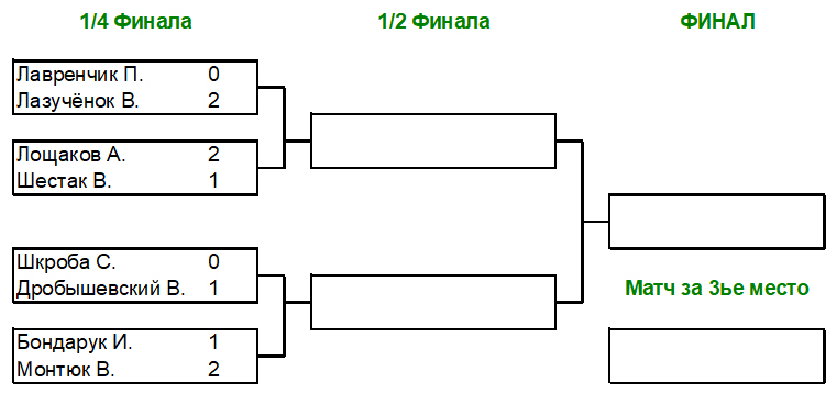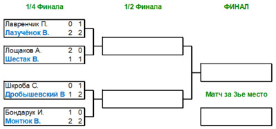 За четвёртую же строчку поборются в заочном противостоянии Андрей Лощаков и Иван Бондарук, по-разному проведшие отчётный отрезок турнира. Андрею дважды досталась техническая победа: сначала дома с Карпаловым, а затем в гостях с Карватом, между которыми уместилась гостевая безголевая ничья непосредственно с Иваном, который туром ранее минимально уступил на выезде Усику, но в крайнем туре одержал уверенную гостевую викторию над Карпаловым, что значительно повысило шансы Ивана на место в плей-офф. В заключительном туре Бондарук примет Карвата, а вот Андрею Лощакову предстоит встретиться с весьма мотивированным Дробышевским. Также дома сыграет Вадим Букач, который имеет теоретические шансы на место в плей-офф в случае неудач двух вышестоящих конкурентов, благодаря своему более бескомпромиссному статусу. А точнее, Вадима даже устроит поражение Андрея и ничья Ивана, при этом и самому необходимо обыгрывать лидера таблицы, поэтому последний тур в группе 1 обещает быть очень жарким.